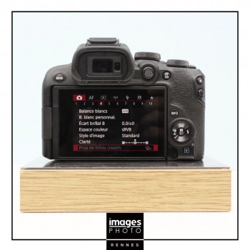 Livré dans sa boîte d'origine avec bouchon boîtier, bouchons avant/arrière objectif, batterie, chargeur, courroie, pare-soleil et filtre protecteur Hoya.
